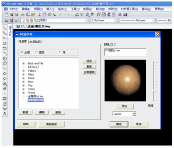 然后为螺丝刀的手柄添加材质,要注意的是手柄上除了5个凹下去的地方外,其余地方都是红色油漆材质,所以手柄的红色部分可以不用加材质,原色就为红色了。而黄色部分是需要加上木制的材质的,可以在运行材质功能的提示“指定材质到: <选择(S)>/图层(L)/颜色(C)/浏览(B):”中选择颜色,也就是键入“C”来运行,这时会弹出一个颜色选择对话框,选择黄色,就进入了材质指定的对话框,按照上面所讲的方式,建立一个木材的材质,然后“确定”,这时手柄的凹下部分就被赋予了木材材质。