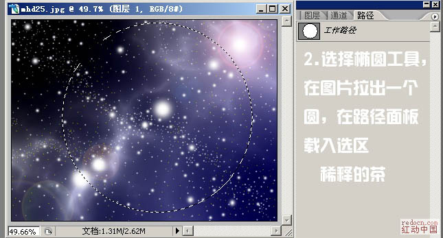 2、选择椭圆选框工具,在画布的中心位置,按住Shift 键拉出下图所示的正圆选区,如下图。