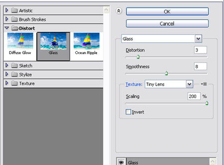 3、滤镜>扭曲>玻璃 ,设置扭曲3,光滑度8 , 纹理:小镜头 ,并缩放到200%。