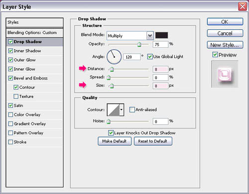 5、双击文字层,应用以下样式:阴影: 改变距离和大小8像素。