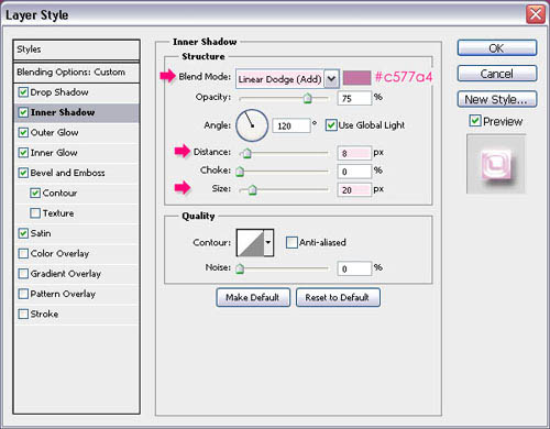 6、内阴影:更改混合模式以线性减淡(添加),其颜色为#c577a4 。另外,更改距离至8,大小到20。