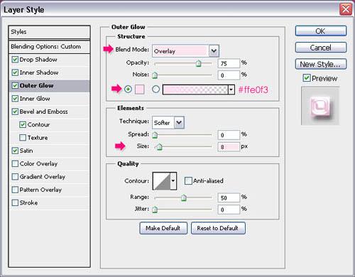 7、外发光:更改混合模式来叠加 ,对颜色#ffe0f3的大小以8像素。