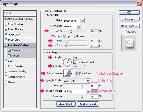 9、斜面和浮雕:更改深度到300 ,尺寸16 ,而软化1 。取消勾选使用全局光,更改角度对70和高度30 。更改 光泽等高线,选择缺口波浪 ,并检查消除锯齿方块。另外,更改高光模式为柔光 ,其颜色为#ffe8f6和影子模式颜色为#d495bb。