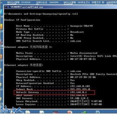 (2)会DOS命令的,在“开始”--“运行”对话框里输入“cmd”打开命令方式,再输入“ipconfig /all”就会得到本地网关地址。