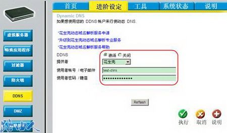 一、友讯路由器进阶设定→DDNS,填入所申请到的花生壳的帐号和密码,点击执行