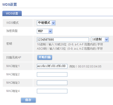 开启A路由器的WDS中继模式,加密方式选择一个,密钥填写正确,频道选择一个(不能自动选择)扫描,扫描AP,找到B路由器的SSID,连接,保存,重启。