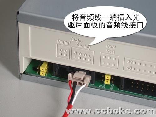 第三步:光驱一般还附赠有音频线,将音频线一端按照正确的方向插入光驱后面板的音频线接口中(如图2所示),另一端插入声卡上标记有CD-In的插座上。有些外接声卡或板载声卡还会对应不同品牌的光驱,提供2个以上CD-In插座,这时大家就要根据光驱的品牌对应插入适用的插座中。