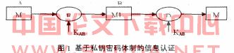 ①基于私钥密码体制的认证。假设通信双方为A和B。A,B共享的密钥为KAB,M为A发送给B的信息。为防止信息M在传输信道被窃听,A将M加密后再传送,如图1所示