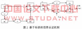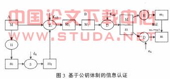 在图2中,用户A首先对信息M求HASH值H(M),之后将H(M)加密成为m,然后将m。和M一起发送给B,用户B通过解密ml并对附于信息M之后的HASH值进行比较,比较两者是否一致。图2给出的信息认证方案可以实现信息来源和完整性的认证。基于私钥的信息认证的机制的优点是速度较快,缺点是通信双方A和B需要事先约定共享密钥KAB。