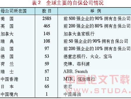 全球500强企业的80%都拥有自保公司。设立自保公司的著名企业也分布于全球各地。表2列举了全球主要的设立自保公司的母公司情况。另外也有很多的组织、协会以及连锁企业等设立自保公司。