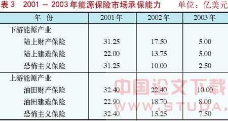 2001年“9·11”事件之后,国际能源保险市场的承保能力萎缩(见表3),中国海油同其他公司一样,面临保费成本大幅增加,保险保障范围却不断减少的境遇。免赔额水平从25万美元增加到100万美元,同时费率还上涨了25%。尤其是海上钻井所需购买的井喷控制保险,费率由4美元/英尺甚至增加到90美元/英尺。保费成本占总钻井成本的比例高达10%,远高于“9·11”之前1%的水平。