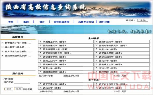 目前,现存的网站也有关于陕西省高校信息查询的功能,但是功能不是很完善,有很多的不足之处。一方面它不能分成多种类别,按用户的不同需求来查询相关的高校信息;另一方面高校相关信息比较零散。所以研究高校信息查询系统十分有必要。