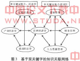 如图3所示,在一个具有7个知识点的示例系统中,算法先根据单关键字集合S,{经济学}进行绘图,其次根据单关键字集合管理学进行绘图.“管理经济学”知识点因为同时具有管理学、经济学两个关键词,因此同时处于左、右两个有向完全子图中.图3就是这7个知识点根据2个单关键字集合所绘制的知识关联网络.