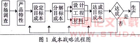 成本战略通过市场调查,确定消费者需要的产品特性,进而设立该产品的目标成本,预先限定产品成本的最高限额,规定制造过程中实际消耗的成本不准超过这一限额,然后要求设计、工程、外购材料等各阶段的各部门通力合作达成目标成本。只有在最后工序达成成本降低额的目标后,才能进入实际制造阶段,否则仍要通过多重循环挤压目标成本达到降低实际成本的目的。从图1中可以看出,成本战略将降低成本的立足点从传统的生产现场转移到产品的策划、构思、设计阶段,从业务链的下游转移到源头。直观的说,设计就是在图纸上制造产品,在图纸上就对实际发生的产品成本进行虚拟模拟,可以大大降低开发新产品的成本。