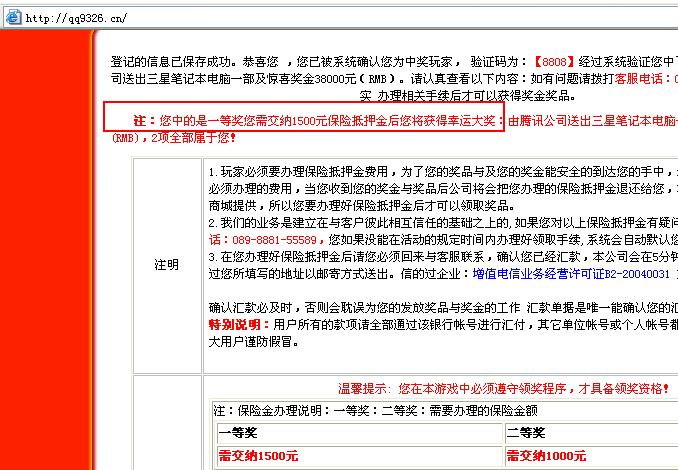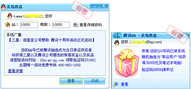 近来,腾讯公司收到热心QQ用户的举报,反映一些不法分子以“QQ号码中奖通知”等假冒系统消息的名义发布诈骗信息,借机骗取QQ用户钱财。对此,腾讯QQ安全团队提醒广大用户,不要相信任何“QQ中奖”消息,更不要向诈骗分子汇款。据了解,此类假冒系统消息实为木马病毒,网络诈骗团伙通过木马病毒入侵用户系统,伪装成QQ系统消息,将其引导到诈骗网站,用户仅通过外观很难辨认。为此,QQ安全团队特别提供了“假冒系统消息病毒”解决方案,并公布该病毒的详细特征,希望广大网友加强安全防范意识,不要上当受骗。 QQ安全团队提醒广大用户不要相信任何“QQ中奖”消息,更不要向“网络活动”组织者汇款(无论任何理由任何金额),最大限度地保护个人信息和财产安全。 A 预防保护方案 2、验证网址安全 3、举报可疑 B 病毒查杀方案 C 损失钱财补救方案 QQ安全团队专门设立了“网络骗术举报”专题讨论区,公布了最新的网络诈骗案例,用户可以访问讨论区及时了解最新骗术以及讨论、举报疑似诈骗信息。如果您还需要进一步的咨询,请访问腾讯客服中心网站获取更多的帮助信息。 附:《腾讯公司提醒QQ用户谨防诈骗的公告》 QQ安全工程师分析发现,与传统病毒不同的是,此类假冒系统消息病毒不盗号、不破坏正常文件,仅发布诈骗消息。该木马病毒常利用“下载器”病毒进行传播。 注:“下载器”病毒是一种木马程序,一般会捆绑多种类型的病毒文件,通过某种途径(如利用系统漏洞攻击、下载电子邮件附件)侵入用户计算机并运行后,会自动从一个或多个网络地址下载新的病毒或木马文件,导致最新病毒源源不断地到达指定计算机,从而达到盗号等恶意目的。 该病毒入侵用户的计算机后,会自动弹出伪造的QQ系统消息。用户一旦点击,就有可能感染上此类病毒,在不知情的情况下被引导到诈骗网站,一些病毒“变种”甚至能够在用户启动QQ后再弹出消息,通过技术手段非法获取用户的QQ号码和昵称。 木马病毒伪装成QQ系统消息界面: 用户一旦点击“查看”按钮,就会访问不法分子预定的诈骗网站。以下是最近收集到的诈骗网站地址: 这些网站通常是骗子自行注册的网站,他们通过制作虚假的活动信息、虚假的高额奖品、虚假的公证材料,千方百计诱使用户相信QQ号码的确“中奖”。 当用户与不法分子取得联系后,对方就会以税费、手续费等借口要求用户汇款。当然,一旦用户进行汇款操作,对方则会试图继续诈骗,直到用户发觉上当后,诈骗分子就会立即消失。