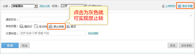 如果您使用的是新版编辑器,将文章调整为“编辑状态”后拉到底部后点击“更多设置”,将“禁止转载”按钮点击为灰色就可实现禁止他人转载您的文章。如图: